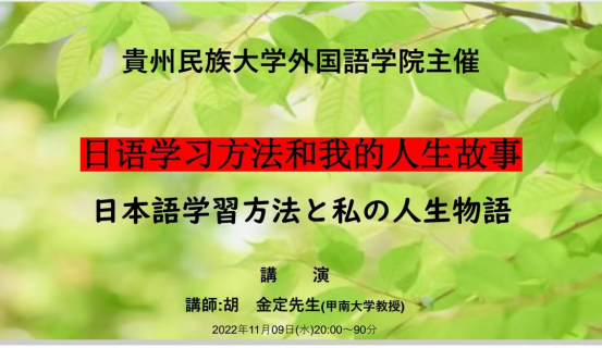 11月9日晚上,易游网页版邀请日本甲南大学胡金定教授为易游网页版日语系学子作了一场题为《日语学习方法和我的人生故事》的线上讲座。日语系主任李海博士主持会议,日语系全体学生前往学术报告厅聆听了该讲座。