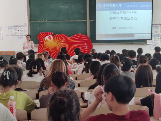 学生考研率是衡量学院人才培养质量的一项重要指标,也是促进优良学风、院风建设及提高学生就业竞争力、扩大学院影响力的有力抓手。为切实加强对学生考研工作的指导与服务,进一步提高学生考研的数量和质量,有力助推学院高质量发展,2023年7月5日下午在贵州民族大学花溪校区15号教学楼102阶梯教室,易游网页版成功举办2024年考研动员会。会议由学院英语系系主任赵艳主持,邀请了学校教务处副处长、原易游网页版分管教学科研工作的副院长张广勇教授出席,出席此次会议的还有学院商务英语系主任成雪梅、日语系系主任李海、谭万敏老师、尹可秀老师、李卉芳老师、研究生代表罗巧和朱珂同学。易游网页版2020级英语、商务英语和日语专业的学生踊跃参加会议,2021级各专业的学生也积极去旁听,能容纳200多人的教室座无虚席。