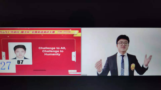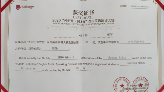 在我校易游网页版领导的大力支持下,由易游网页版胡静老师指导的文学院2017级戏剧影视文学专业的赵千禧同学在第一阶段演讲中以“Challenge to All, Challenge to Humanity”为题,稳定发挥,以小组赛第二的成绩(89.75分)突围进入15日第二阶段(线上)比赛,成为本次演讲大赛贵州省唯一进入88强的选手,最终荣获全国英语演讲大赛二等奖,再创历史最好成绩!