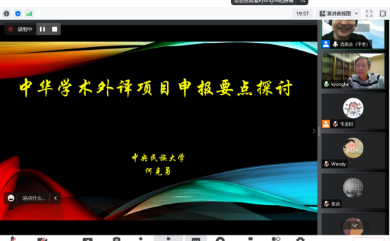 2022年6月18日晚,中央民族大学何克勇教授应邀做客易游网页版“新知讲坛”,通过腾讯会议线上平台进行了题为“中华学术外译项目申报要点探讨”的报告。本次讲座由易游网页版院长肖唐金教授主持,来自校内外的数十名师生参加了本次讲座。