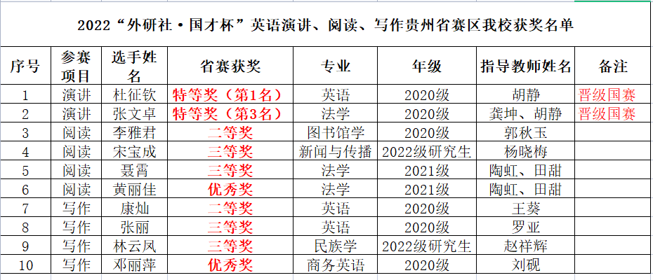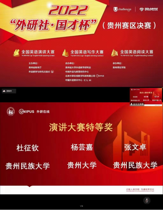 “外研社·国才杯”英语演讲、写作、阅读比赛是外语类被列入中国高等教育学会高校竞赛排行榜首位的大赛。贵州省赛区决赛于2022年11月5日在贵州师范学院举行,贵州民族大学选手在易游网页版教师的指导下表现不俗,取得成绩如下: