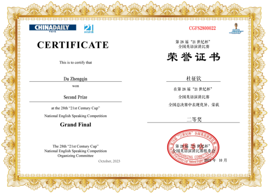据悉,“21世纪杯”全国英语演讲比赛由中国日报社创办于1996年,是以中国日报China Daily为指导单位、以21世纪报社为主办单位的全国性英语演讲赛事。自1996年创办以来,大赛作为每年5月在英国伦敦举行的国际公众演讲比赛(IPSC)的中国区唯一选拔赛,历时28年,举办至今。在今年3月份公布的《2023全国普通高校大学生竞赛分析报告》中,“21世纪杯”全国英语演讲比赛入选“全国学科竞赛名单”,属于国家级A类学科竞赛,是国家教育部官方认可的全国性赛事之一。