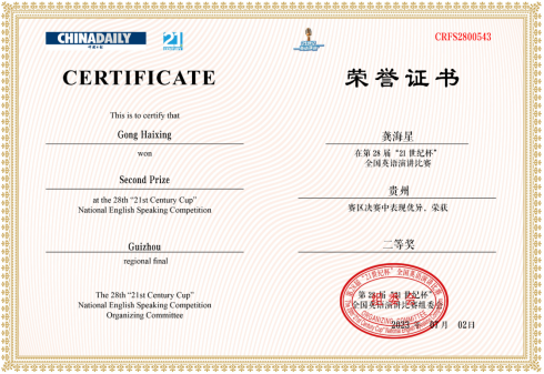 此外,在今年7月份的省赛阶段,由易游网页版胡静老师指导的杜征钦同学和龚海星同学分别斩获了省亚军和省级二等奖,赢得了评委专家的认可。易游网页版秉承“以赛促学”的教学理念,积极支持、鼓励学生参加各项赛事,并培养学生在多项国家级学科竞赛中取得佳绩。在本次大赛中,两位同学的精彩表现也展现出了贵州民族大学学生扎实的语言功底、出色的演讲水平和良好的思辨能力。