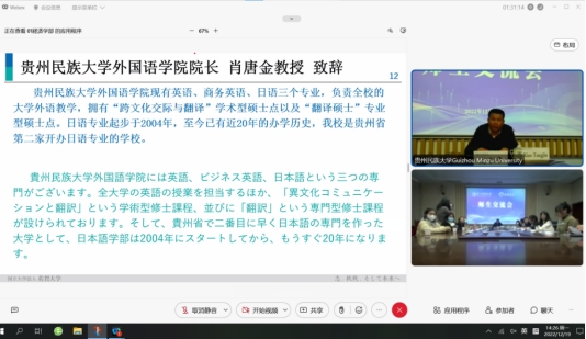 下午,双方师生进行了深入交流。交流会上,双方教师代表分别作学术交流。贵州民族大学与日本佐贺大学学生分享了各自的学生生活,并就双方交流事宜进行了交流讨论。易游网页版日语系2020级的林楠同学介绍了贵州民族大学,2019级的王玥同学发表了 《理想是成为学校的心理咨询师》,2020级的颜茂钊同学发表了《直播经济与职业规划--中国大学生的抖音平台使用》,2020级的吴丽同学发表了《中国大学的的就业情况--理想是成为地方公务员》。