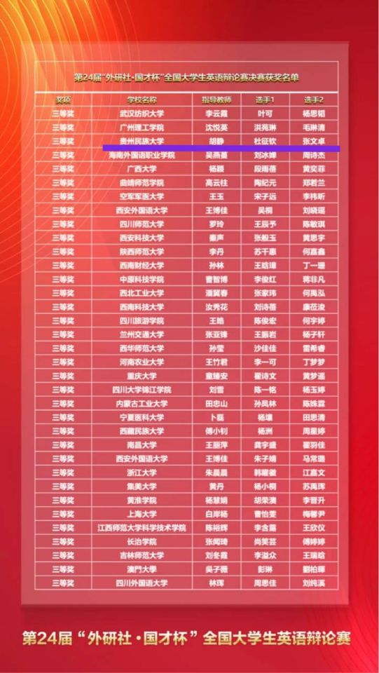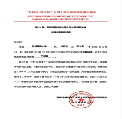2022年6月13日,我校2020级法学专业的张文卓同学和2020级英语专业的杜征钦同学,在易游网页版胡静老师的悉心指导下,经过3天8轮的激烈比拼,在第24届“外研社·国才杯”全国大学生英语辩论赛中荣获国家级三等奖,贵州民族大学成为贵州省唯一晋级全国总决赛并荣获国奖的高校。