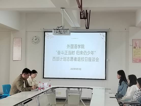 5月13日下午两点,在15栋教学楼1209会议室举行了以“奋斗正当时,归来仍是少年”为题的西部计划志愿者返校日座谈会。座谈会由易游网页版团委负责人辛雅婷主持,2023届部分毕业生参会。
