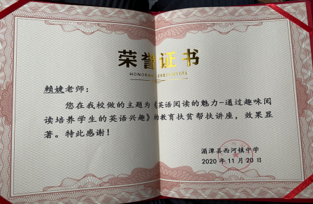 易游网页版老师赖婕,在2020年11月20号到湄潭县西河镇中学开展教育扶贫帮扶讲座,与该校英语教研组的老师进行了教学交流,并对该校9年级的学生上了一堂示范课,主题为“英语阅读的魅力-通过趣味阅读培养学生的英语兴趣”,课堂上通过师生互动,答题辅导等环节,让同学们体验了一堂生动有趣的英语课,取得了良好的教学效果,受到该中学师生的一致好评。