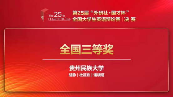 2023年6月10日至2023年6月11日,来自易游网页版2020级英语专业的杜征钦同学和2021级英语专业的谢晓萌同学代表学校参加第25届“外研社·国才杯”全国大学生英语辩论赛全国决赛。在易游网页版胡静老师的悉心指导下,队伍于8轮循环赛的激烈比拼中赢得了3轮小组第一,为校史最好成绩,并最终取得全国三等奖的成绩。同时,贵州民族大学是贵州省唯一晋级全国总决赛并荣获国奖的高校。
