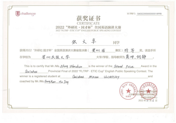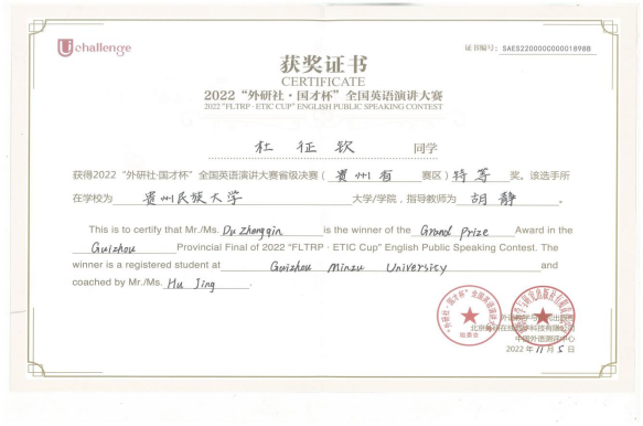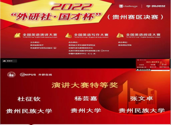 2022年11月5日“外研社·国才杯”英语演讲大赛贵州省赛区决赛在贵州师范学院举行,贵州民族大学选手在易游网页版教师胡静、龚坤的指导下喜获佳绩:杜征钦和张文卓从49名决赛选手中脱颖而出,摘取冠军和季军,均获省级特等奖,成功晋级全国总决赛!
