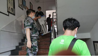 吴贤勇(左一)、杨卓远(左二)人梯搬运清理干净的上课桌椅